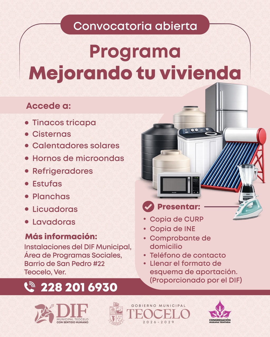 Con el objetivo de contribuir al bienestar de las familias del municipio, el Sistema DIF Municipal de Teocelo impulsa el programa “Mejorando tu Vivienda”, una iniciativa orientada a facilitar el acceso a artículos de línea blanca mediante un esquema de subsidio.